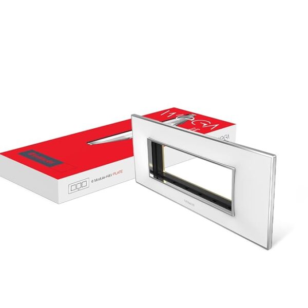 Goldmedal Wega 6M Frame Plate in ABS White, designed for durability and a sleek finish, perfect for any modern electrical setup. Easy to install and compatible with standard switches.